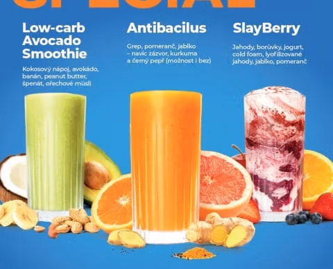A jaké jsou naše nové drinky? ANTIBACILUS je funkční citrusovou-kořeněný drink, který osvěžuje, zahřívá, podporuje imunitu a dodává energii bez kofeinu. Je postavený na pomeranči, grepu a jablku a doplněný o zázvor, kurkumu a černý pepř, které jsou známe svými přirozenými podpůrnými účinky. Je určen pro zákazníky, kteří chtějí něco zdravého, řeší únavu a nachlazení nebo chtějí podpořit svou imunitu. LOW CARB AVOCADO SMOOTHIE je sytý, krémový a nutričně bohatý drink. Díky avokádu a arašídovému máslu dodá kvalitní tuky, špenát dodá mikronutrienty a ořechové müsli strukturu. Je určen nejen pro fitness komunitu zákazníků, ale pro všechny kdo - řeší makra, sportuje, chce zdravou a vyváženou svačinu a nechce „cukrovou bombu“. SLAY BERRY drink primárně pro GEN Z a milovníky vizuálně zajímavých drinků. Je atraktivní, jemně krémový a vytvořen pro fotku. Kombinace jahod, borůvek, citrusů a Cold Foam vytváří kontrast chutí i textur. Jahodový prášek pak zvýrazňuje barvu i chuť. Je určen nejen pro GEN Z, ale pro všechny, kdo chtějí něco jiného.